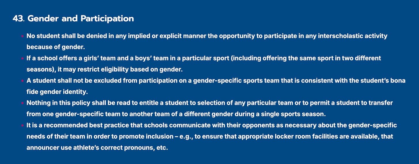 While the MIAA is still stuck in the mire of gender-woo, as evidenced by training material on their website (above) and their policies regarding gender identity (below), we think it’s well past time for them to come to terms with the fact that they are on the wrong side of this issue. The US Supreme Court may ultimately come down with a ruling on gender identity and sports participation that could force their hand, but it would be better if they did the right thing all on their own and protected Massachusetts girls.