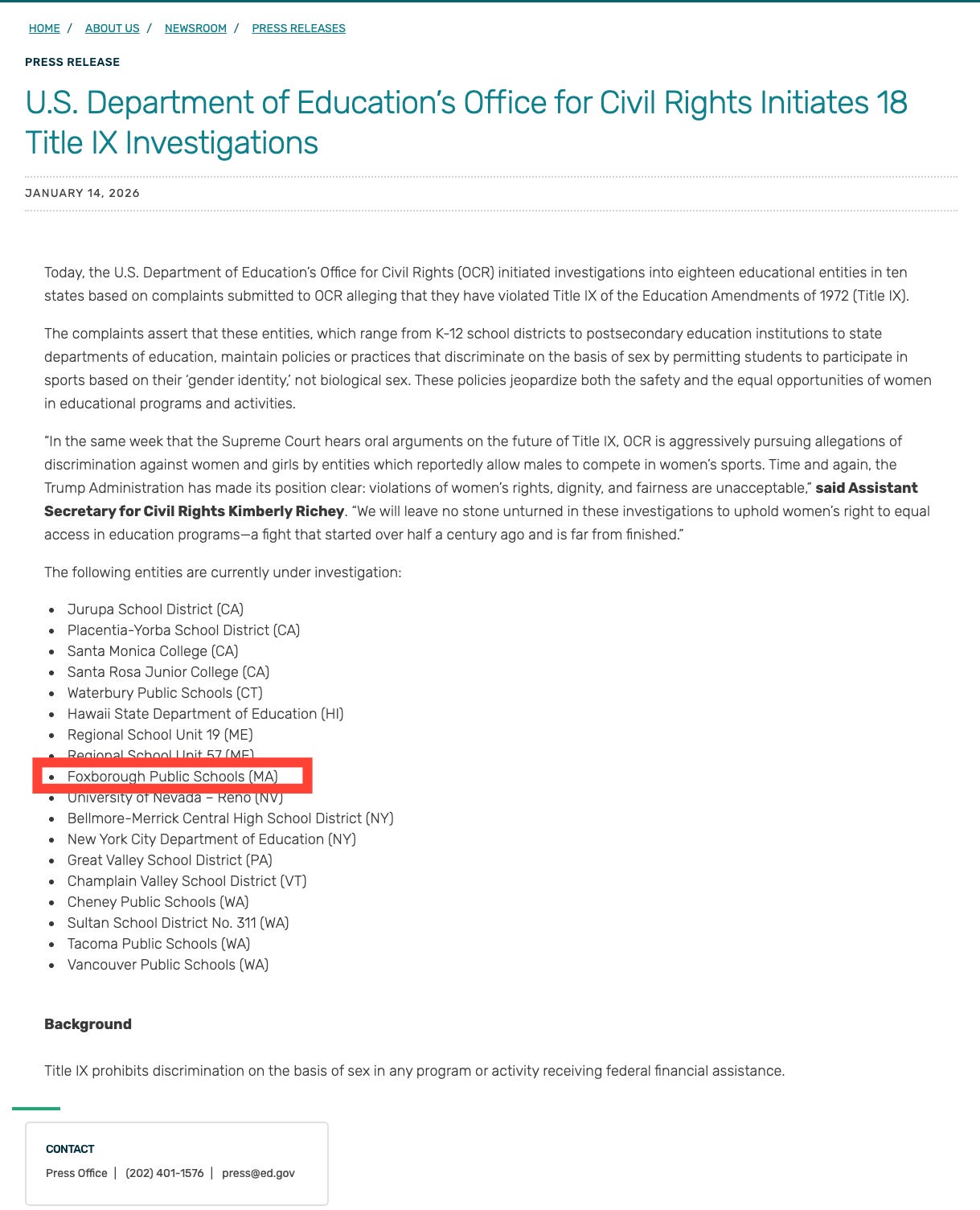 The next meeting of the Pembroke school committee will be held on February 3rd, 2026 at 6:00pm, at the North Pembroke Elementary School Library. We encourage every common-sense parent and citizen who believes girls sports and private spaces should be protected to attend this meeting and speak up (come early to sign up to speak). Ask the Pembroke school committee to do the right thing and petition the MIAA for change. Protecting girls isn’t extreme. It is the only rational position.