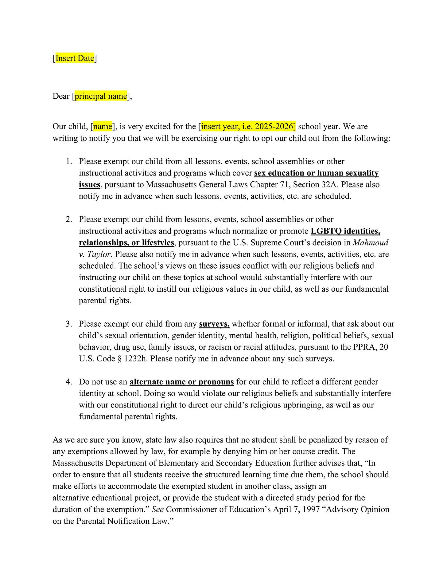 The Massachusetts Liberty Legal Center has now released two important documents: the Massachusetts Legal Advisory: Mahmoud v. Taylor and the Constitutional Right to Religious Opt-Outs in Public Schools, and an updated opt-out form that religious parents can use to opt their children out of sex ed, instructional activities and programs covering issues of sexual orientation or gender identity, surveys, and name/pronoun changes related to social transition. (Note: the opt out form in this post was updated on 1/26 to reflect a recent legal victory. If you have downloaded an older version of this form previously, we recommend using this new one instead.)